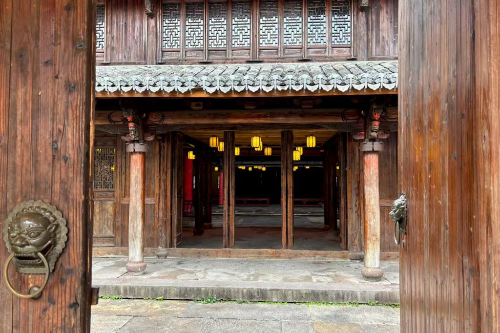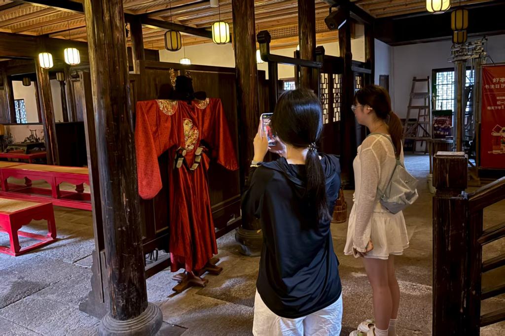 如今的状元第在文旅发展的带动下,成为了经典历史故事演绎的大众场所。坊内时有演出活动,能让游客了解文化历史的同时感受视听的双重享受。队员们穿过正厅,看见摆放整齐的书案和长椅。一身绣着蟒纹的状元红袍在展架上静静陈列。金线绣成的云纹在灯光下流转,虽非秦鸣雷当年的亲着状元袍,但透过丝线仿佛仍能看见当年的庄重。