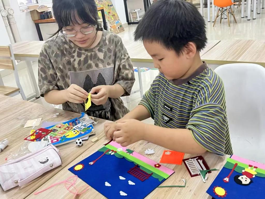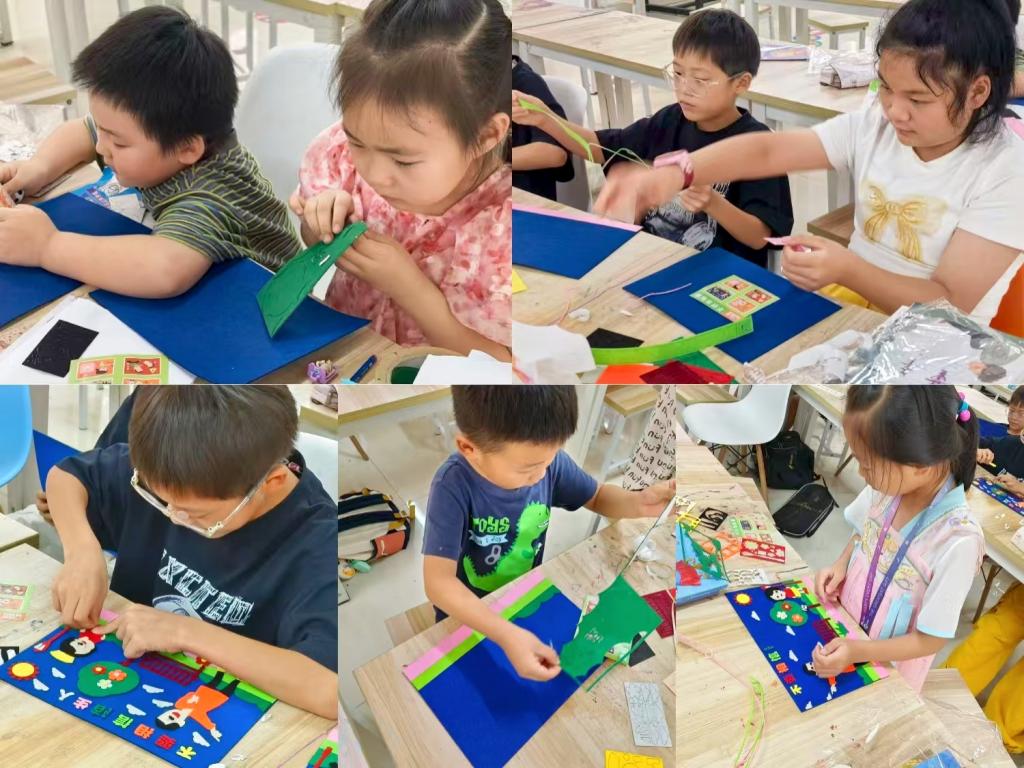 在不织布手工环节中,实践队员提前准备了色彩丰富的不织布材料和以“不要相信陌生人”为主题的图案模板——有象征光明的太阳、提醒警惕的鲜亮文字,还有寓意安全守护的白云等。小朋友们在队员的指导下剪裁、粘贴一个个元素,用巧手将一块块布料变成传递安全理念的小作品。当一件件充满童趣的安全主题作品完成时,孩子们不仅脸上洋溢着成就感,更在动手过程中加深了对“提高警惕、保护自己”的理解。
