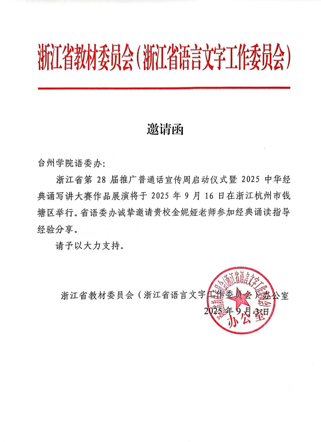 近日,浙江省第28届全国推广普通话宣传周启动仪式暨2025年中华经典诵写讲作品展演活动在杭州市文海小学顺利举行。yl6809永利官网副教授金妮娅受邀出席,并在活动中分享了多年来指导经典诵读大赛的宝贵经验。